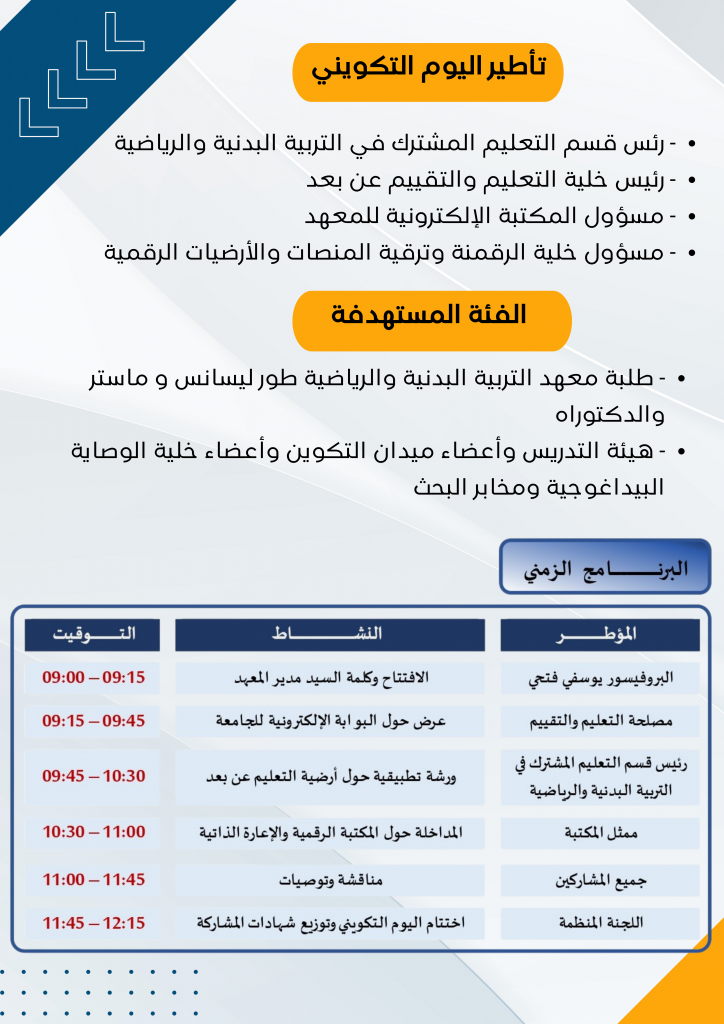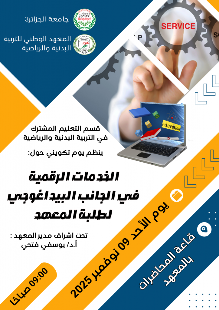 تحت إشراف البروفيسور يوسفي فتحي – مدير المعهد الوطني للتربية البدنية والرياضية – جامعة الجزائر 3 ؛ ينظم قسم التعليم المشترك في التربية البدنية والرياضية يوم تكويني حول: الخدمات الرقمية في الجانب البيداغوجي لطلبة المعهد
