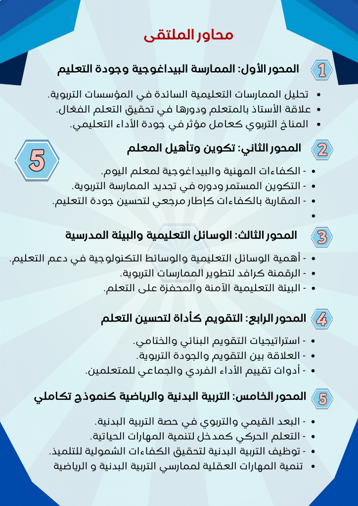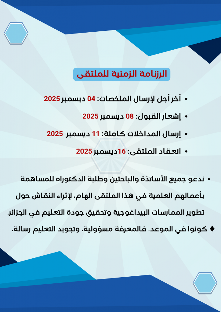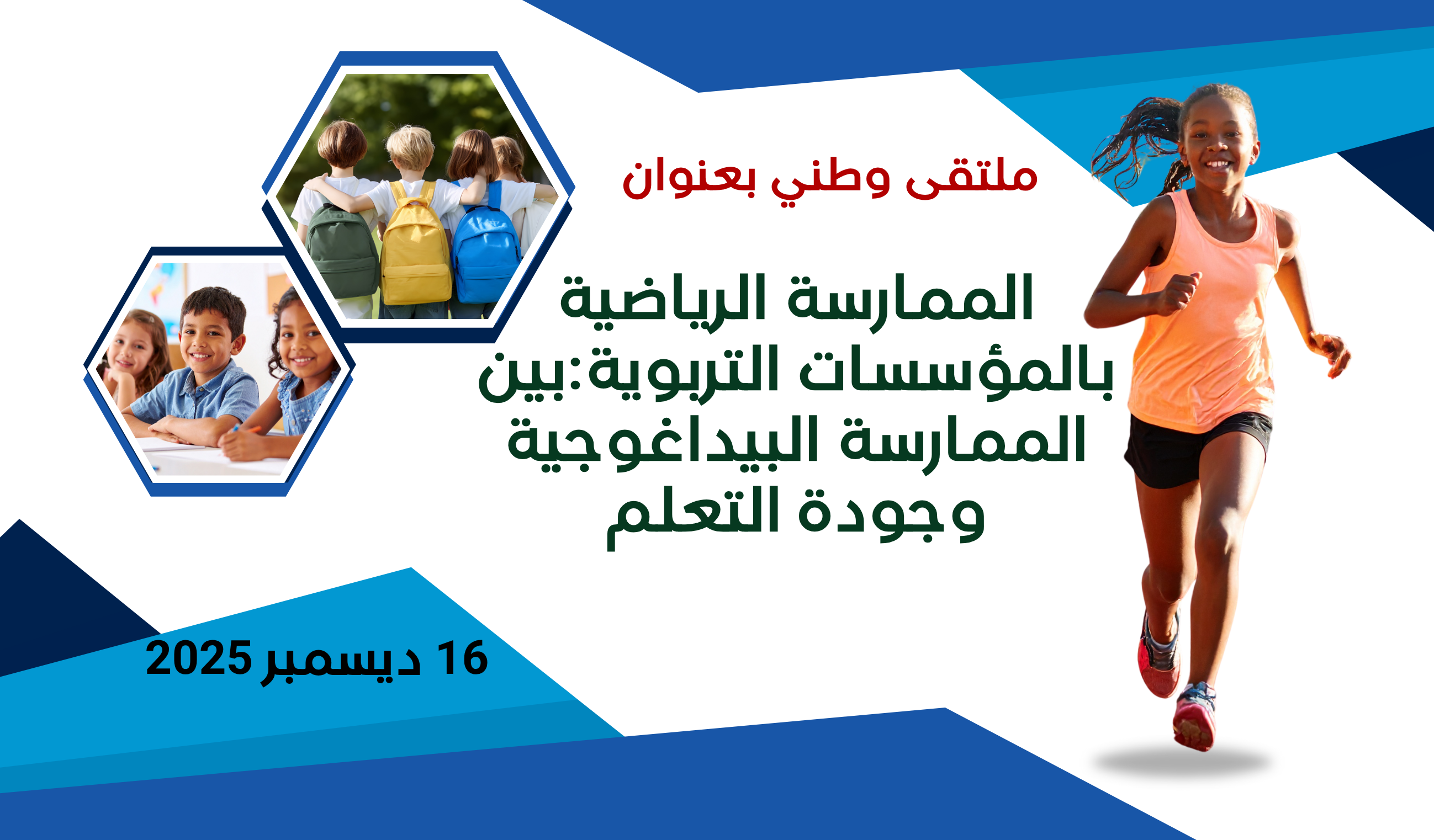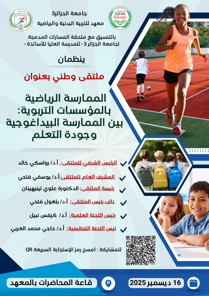 يعلن المعهد الوطني للتربية البدنية والرياضية -لجامعة الجزائر3 عن تنظيم ملتقى وطني بعنوان: الممارسة الرياضية في المؤسسات التربوية: بين الممارسة البيداغوجية وجودة التعلم وذلك يوم 16 ديسمبر 2025 .