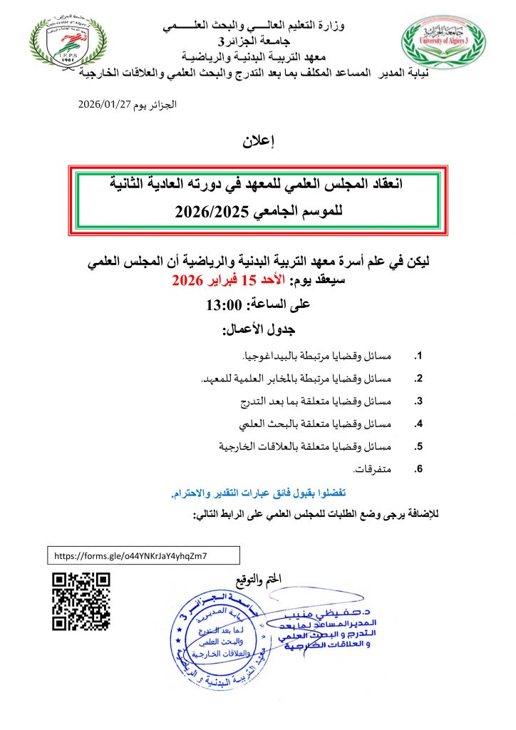 – رئيس المجلس العلمي للمعهد: الأستاذ الدكتور: كرفس نبيل