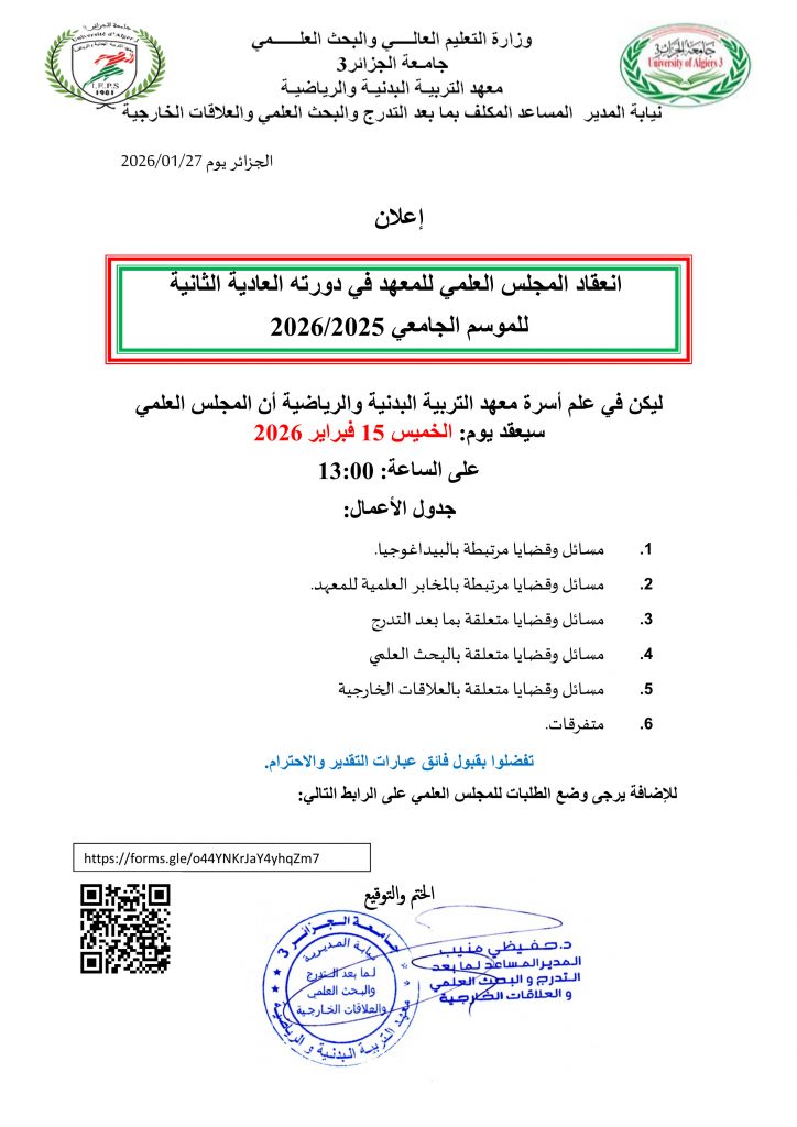 مخرجات اجتماع المجلس العلمي في دورته العادية الأولى للموسم الجامعي 2022-2023 ( للإطلاع أنقر هنا )